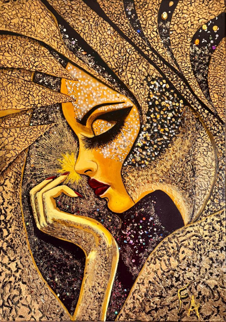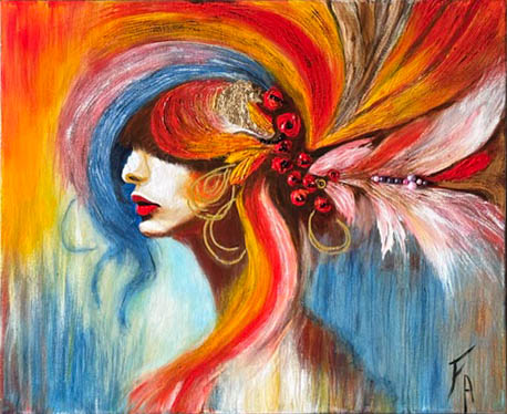 Tel un tourbillon, le pinceau c’est envolé dans une inspiration surprenante contournant ce visage mystérieux en ces jours de février. Mes pensées s’en sont allées sans doute au carnaval de Venise, nostalgique du vécu, empressé de s’y retrouver à nouveau. Un visage gracieux où se cache des yeux sous une chevelure tel un masque vénitien, des lèvres pulpeuses, sensuelles, d’un rouge éclatant, une coiffe particulière garnie d’un bouquet de roses qui le ramène à la Saint Valentin. La voilà parée de ses fleurs, de ses plumes et de ses perles ma belle vénitienne prête à déambuler dans les ruelles étroites de la sérénissime, à flâner le long des quais qui bordent la lagune dans une ambiance festive où les sons musicaux le transportent dans un autre monde.