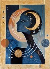 La femme lune de profil, belle et sobre à la fois dans l’univers,en fond notre terre dont elle s’en éloigne l’espace d’un temps. Revigoré et plein d’énergie, le pinceau chargé d’émotions s’en est allé, par sa gestuelle lui donne forme avec sa palette de fondus épurés. Le pinceau se transforme en femme lune, se laisse ainsi porter par ses rêves et ses envies, il joue avec les étoiles, parcours l’univers à la rencontre des autres planètes, évite le soleil par la peur de se brûler.  Le temps a passé, un son musical au piano le ramène dans son atmosphère terrestre. C’est à ce moment là que le pinceau découvre la femme lune.
